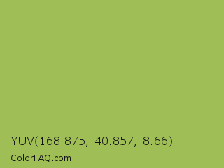 YUV 168.875,-40.857,-8.66 Color is a normal lime color and the nearest color is Middle Green Yellow #acbf60. Hex code #9fbe56 and RGB value is rgb(159,190,86). In RGB color space, this color is composed of 62% red, 75% green, 34% blue, In CMYK color space, this color is composed of 16% cyan, 0% magenta, 55% yellow , 25% black , In HSL color space, this color has a hue angle of 78° , 44% saturation and 54% lightness.