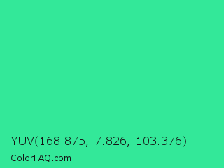 YUV 168.875,-7.826,-103.376 Color is a normal green color and the nearest color is Shamrock #33cc99. Hex code #33e899 and RGB value is rgb(51,232,153). In RGB color space, this color is composed of 20% red, 91% green, 60% blue, In CMYK color space, this color is composed of 78% cyan, 0% magenta, 34% yellow , 9% black , In HSL color space, this color has a hue angle of 154° , 80% saturation and 55% lightness.