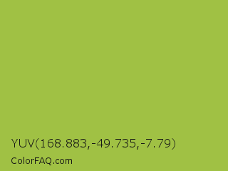 YUV 168.883,-49.735,-7.79 Color is a normal lime color and the nearest color is Android Green #a4c639. Hex code #a0c144 and RGB value is rgb(160,193,68). In RGB color space, this color is composed of 63% red, 76% green, 27% blue, In CMYK color space, this color is composed of 17% cyan, 0% magenta, 65% yellow , 24% black , In HSL color space, this color has a hue angle of 76° , 50% saturation and 51% lightness.