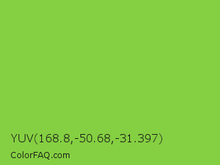 YUV 168.8,-50.68,-31.397 Color is a normal green color and the nearest color is Kiwi #8ee53f. Hex code #85cf42 and RGB value is rgb(133,207,66). In RGB color space, this color is composed of 52% red, 81% green, 26% blue, In CMYK color space, this color is composed of 36% cyan, 0% magenta, 68% yellow , 19% black , In HSL color space, this color has a hue angle of 91° , 59% saturation and 54% lightness.