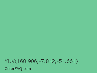 YUV 168.906,-7.842,-51.661 Color is a light green color and the nearest color is De York #7ac488. Hex code #6eca99 and RGB value is rgb(110,202,153). In RGB color space, this color is composed of 43% red, 79% green, 60% blue, In CMYK color space, this color is composed of 46% cyan, 0% magenta, 24% yellow , 21% black , In HSL color space, this color has a hue angle of 148° , 46% saturation and 61% lightness.