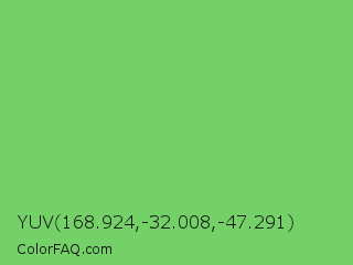 YUV 168.924,-32.008,-47.291 Color is a light green color and the nearest color is Mantis #74c365. Hex code #73d168 and RGB value is rgb(115,209,104). In RGB color space, this color is composed of 45% red, 82% green, 41% blue, In CMYK color space, this color is composed of 45% cyan, 0% magenta, 50% yellow , 18% black , In HSL color space, this color has a hue angle of 114° , 53% saturation and 61% lightness.