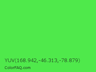YUV 168.942,-46.313,-78.879 Color is a normal green color and the nearest color is Screamin Green #66ff66. Hex code #4fe94b and RGB value is rgb(79,233,75). In RGB color space, this color is composed of 31% red, 91% green, 29% blue, In CMYK color space, this color is composed of 66% cyan, 0% magenta, 68% yellow , 9% black , In HSL color space, this color has a hue angle of 118° , 78% saturation and 60% lightness.