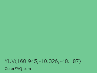 YUV 168.945,-10.326,-48.187 Color is a light green color and the nearest color is De York #7ac488. Hex code #72c994 and RGB value is rgb(114,201,148). In RGB color space, this color is composed of 45% red, 79% green, 58% blue, In CMYK color space, this color is composed of 43% cyan, 0% magenta, 26% yellow , 21% black , In HSL color space, this color has a hue angle of 143° , 45% saturation and 62% lightness.