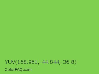 YUV 168.961,-44.844,-36.8 Color is a normal green color and the nearest color is Mantis #74c365. Hex code #7fd04e and RGB value is rgb(127,208,78). In RGB color space, this color is composed of 50% red, 82% green, 31% blue, In CMYK color space, this color is composed of 39% cyan, 0% magenta, 63% yellow , 18% black , In HSL color space, this color has a hue angle of 97° , 58% saturation and 56% lightness.