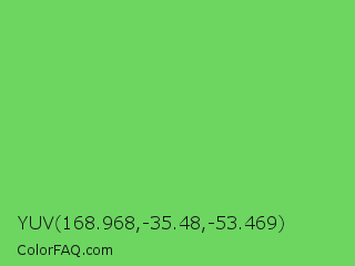YUV 168.968,-35.48,-53.469 Color is a light green color and the nearest color is Mantis #74c365. Hex code #6cd661 and RGB value is rgb(108,214,97). In RGB color space, this color is composed of 42% red, 84% green, 38% blue, In CMYK color space, this color is composed of 50% cyan, 0% magenta, 55% yellow , 16% black , In HSL color space, this color has a hue angle of 114° , 59% saturation and 61% lightness.