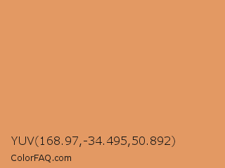 YUV 168.97,-34.495,50.892 Color is a light orange color and the nearest color is Di Serria #db995e. Hex code #e39963 and RGB value is rgb(227,153,99). In RGB color space, this color is composed of 89% red, 60% green, 39% blue, In CMYK color space, this color is composed of 0% cyan, 33% magenta, 56% yellow , 11% black , In HSL color space, this color has a hue angle of 25° , 70% saturation and 64% lightness.