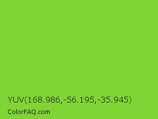 YUV 168.986,-56.195,-35.945 Color is a normal green color and the nearest color is Kiwi #8ee53f. Hex code #80d437 and RGB value is rgb(128,212,55). In RGB color space, this color is composed of 50% red, 83% green, 22% blue, In CMYK color space, this color is composed of 40% cyan, 0% magenta, 74% yellow , 17% black , In HSL color space, this color has a hue angle of 92° , 65% saturation and 52% lightness.