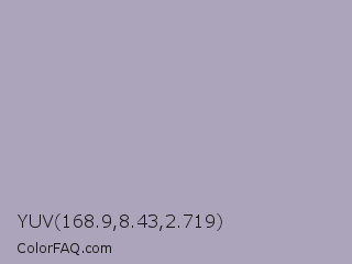 YUV 168.9,8.43,2.719 Color is a light violet color and the nearest color is Spun Pearl #aaabb7. Hex code #aca4ba and RGB value is rgb(172,164,186). In RGB color space, this color is composed of 67% red, 64% green, 73% blue, In CMYK color space, this color is composed of 8% cyan, 12% magenta, 0% yellow , 27% black , In HSL color space, this color has a hue angle of 262° , 14% saturation and 69% lightness.