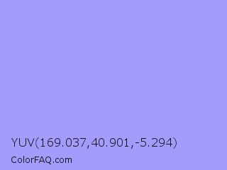 YUV 169.037,40.901,-5.294 Color is a light indigo color and the nearest color is Dull Lavender #a899e6. Hex code #a39cfc and RGB value is rgb(163,156,252). In RGB color space, this color is composed of 64% red, 61% green, 99% blue, In CMYK color space, this color is composed of 35% cyan, 38% magenta, 0% yellow , 1% black , In HSL color space, this color has a hue angle of 244° , 94% saturation and 80% lightness.