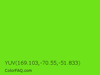 YUV 169.103,-70.55,-51.833 Color is a normal green color and the nearest color is Alien Armpit #84de02. Hex code #6ee31a and RGB value is rgb(110,227,26). In RGB color space, this color is composed of 43% red, 89% green, 10% blue, In CMYK color space, this color is composed of 52% cyan, 0% magenta, 89% yellow , 11% black , In HSL color space, this color has a hue angle of 95° , 79% saturation and 50% lightness.