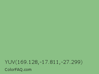 YUV 169.128,-17.811,-27.299 Color is a light green color and the nearest color is Dark Sea Green #8fbc8f. Hex code #8ac085 and RGB value is rgb(138,192,133). In RGB color space, this color is composed of 54% red, 75% green, 52% blue, In CMYK color space, this color is composed of 28% cyan, 0% magenta, 31% yellow , 25% black , In HSL color space, this color has a hue angle of 115° , 32% saturation and 64% lightness.