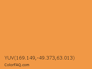 YUV 169.149,-49.373,63.013 Color is a light orange color and the nearest color is Neon Carrot #ffa343. Hex code #f19845 and RGB value is rgb(241,152,69). In RGB color space, this color is composed of 95% red, 60% green, 27% blue, In CMYK color space, this color is composed of 0% cyan, 37% magenta, 71% yellow , 5% black , In HSL color space, this color has a hue angle of 29° , 86% saturation and 61% lightness.