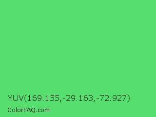 YUV 169.155,-29.163,-72.927 Color is a light green color and the nearest color is Emerald #50c878. Hex code #56df6e and RGB value is rgb(86,223,110). In RGB color space, this color is composed of 34% red, 87% green, 43% blue, In CMYK color space, this color is composed of 61% cyan, 0% magenta, 51% yellow , 13% black , In HSL color space, this color has a hue angle of 131° , 68% saturation and 61% lightness.