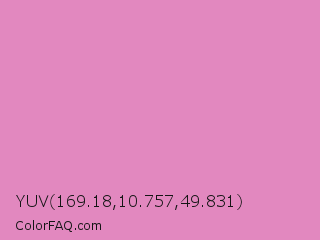 YUV 169.18,10.757,49.831 Color is a light magenta color and the nearest color is Shocking #e292c0. Hex code #e288bf and RGB value is rgb(226,136,191). In RGB color space, this color is composed of 89% red, 53% green, 75% blue, In CMYK color space, this color is composed of 0% cyan, 40% magenta, 15% yellow , 11% black , In HSL color space, this color has a hue angle of 323° , 61% saturation and 71% lightness.
