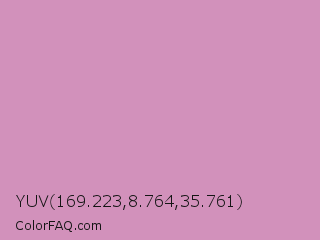 YUV 169.223,8.764,35.761 Color is a light magenta color and the nearest color is Shocking #e292c0. Hex code #d291bb and RGB value is rgb(210,145,187). In RGB color space, this color is composed of 82% red, 57% green, 73% blue, In CMYK color space, this color is composed of 0% cyan, 31% magenta, 11% yellow , 18% black , In HSL color space, this color has a hue angle of 321° , 42% saturation and 70% lightness.