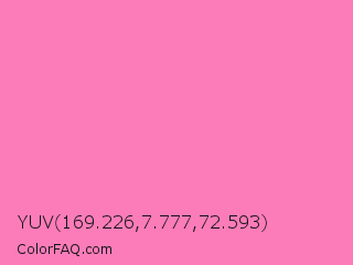 YUV 169.226,7.777,72.593 Color is a light rose color and the nearest color is Persian Pink #f77fbe. Hex code #fc7cb9 and RGB value is rgb(252,124,185). In RGB color space, this color is composed of 99% red, 49% green, 73% blue, In CMYK color space, this color is composed of 0% cyan, 51% magenta, 27% yellow , 1% black , In HSL color space, this color has a hue angle of 331° , 96% saturation and 74% lightness.