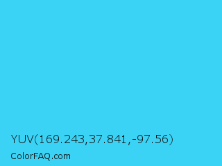 YUV 169.243,37.841,-97.56 Color is a normal cyan color and the nearest color is Picton Blue #45b1e8. Hex code #3ad3f6 and RGB value is rgb(58,211,246). In RGB color space, this color is composed of 23% red, 83% green, 96% blue, In CMYK color space, this color is composed of 76% cyan, 14% magenta, 0% yellow , 4% black , In HSL color space, this color has a hue angle of 191° , 91% saturation and 60% lightness.