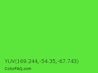 YUV 169.244,-54.35,-67.743 Color is a normal green color and the nearest color is Harlequin Green #46cb18. Hex code #5ce63b and RGB value is rgb(92,230,59). In RGB color space, this color is composed of 36% red, 90% green, 23% blue, In CMYK color space, this color is composed of 60% cyan, 0% magenta, 74% yellow , 10% black , In HSL color space, this color has a hue angle of 108° , 77% saturation and 57% lightness.