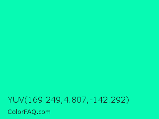 YUV 169.249,4.807,-142.292 Color is a normal green color and the nearest color is Medium Spring Green #00fa9a. Hex code #07fab3 and RGB value is rgb(7,250,179). In RGB color space, this color is composed of 3% red, 98% green, 70% blue, In CMYK color space, this color is composed of 97% cyan, 0% magenta, 28% yellow , 2% black , In HSL color space, this color has a hue angle of 162° , 96% saturation and 50% lightness.