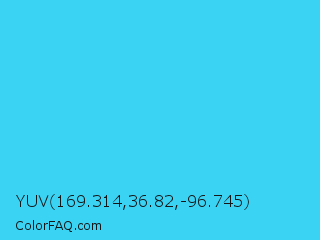 YUV 169.314,36.82,-96.745 Color is a normal cyan color and the nearest color is Picton Blue #45b1e8. Hex code #3bd3f4 and RGB value is rgb(59,211,244). In RGB color space, this color is composed of 23% red, 83% green, 96% blue, In CMYK color space, this color is composed of 76% cyan, 14% magenta, 0% yellow , 4% black , In HSL color space, this color has a hue angle of 191° , 89% saturation and 59% lightness.