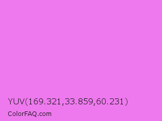 YUV 169.321,33.859,60.231 Color is a light magenta color and the nearest color is Lavender Magenta #ee82ee. Hex code #ee79ee and RGB value is rgb(238,121,238). In RGB color space, this color is composed of 93% red, 47% green, 93% blue, In CMYK color space, this color is composed of 0% cyan, 49% magenta, 0% yellow , 7% black , In HSL color space, this color has a hue angle of 300° , 77% saturation and 70% lightness.