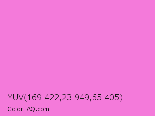 YUV 169.422,23.949,65.405 Color is a light magenta color and the nearest color is Pale Magenta #f984e5. Hex code #f47ada and RGB value is rgb(244,122,218). In RGB color space, this color is composed of 96% red, 48% green, 85% blue, In CMYK color space, this color is composed of 0% cyan, 50% magenta, 11% yellow , 4% black , In HSL color space, this color has a hue angle of 313° , 85% saturation and 72% lightness.