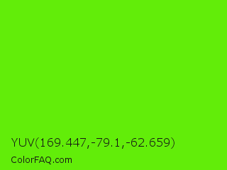YUV 169.447,-79.1,-62.659 Color is a normal green color and the nearest color is Bright Green #66ff00. Hex code #62ed09 and RGB value is rgb(98,237,9). In RGB color space, this color is composed of 38% red, 93% green, 4% blue, In CMYK color space, this color is composed of 59% cyan, 0% magenta, 96% yellow , 7% black , In HSL color space, this color has a hue angle of 97° , 93% saturation and 48% lightness.