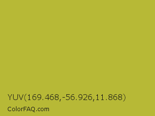 YUV 169.468,-56.926,11.868 Color is a normal yellow color and the nearest color is Earls Green #c9b93b. Hex code #b7b936 and RGB value is rgb(183,185,54). In RGB color space, this color is composed of 72% red, 73% green, 21% blue, In CMYK color space, this color is composed of 1% cyan, 0% magenta, 71% yellow , 27% black , In HSL color space, this color has a hue angle of 61° , 55% saturation and 47% lightness.