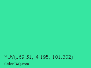 YUV 169.51,-4.195,-101.302 Color is a normal green color and the nearest color is Eucalyptus #44d7a8. Hex code #36e6a1 and RGB value is rgb(54,230,161). In RGB color space, this color is composed of 21% red, 90% green, 63% blue, In CMYK color space, this color is composed of 77% cyan, 0% magenta, 30% yellow , 10% black , In HSL color space, this color has a hue angle of 156° , 78% saturation and 56% lightness.