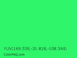 YUV 169.539,-31.818,-108.344 Color is a normal green color and the nearest color is UFO Green #3cd070. Hex code #2ef569 and RGB value is rgb(46,245,105). In RGB color space, this color is composed of 18% red, 96% green, 41% blue, In CMYK color space, this color is composed of 81% cyan, 0% magenta, 57% yellow , 4% black , In HSL color space, this color has a hue angle of 138° , 91% saturation and 57% lightness.