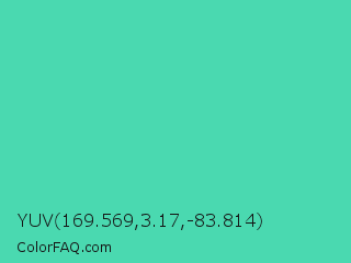 YUV 169.569,3.17,-83.814 Color is a normal green color and the nearest color is Eucalyptus #44d7a8. Hex code #4ad9b0 and RGB value is rgb(74,217,176). In RGB color space, this color is composed of 29% red, 85% green, 69% blue, In CMYK color space, this color is composed of 66% cyan, 0% magenta, 19% yellow , 15% black , In HSL color space, this color has a hue angle of 163° , 65% saturation and 57% lightness.