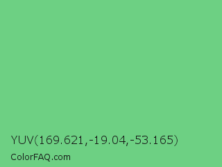 YUV 169.621,-19.04,-53.165 Color is a light green color and the nearest color is De York #7ac488. Hex code #6dd083 and RGB value is rgb(109,208,131). In RGB color space, this color is composed of 43% red, 82% green, 51% blue, In CMYK color space, this color is composed of 48% cyan, 0% magenta, 37% yellow , 18% black , In HSL color space, this color has a hue angle of 133° , 51% saturation and 62% lightness.
