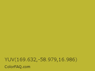 YUV 169.632,-58.979,16.986 Color is a normal yellow color and the nearest color is Earls Green #c9b93b. Hex code #bdb732 and RGB value is rgb(189,183,50). In RGB color space, this color is composed of 74% red, 72% green, 20% blue, In CMYK color space, this color is composed of 0% cyan, 3% magenta, 74% yellow , 26% black , In HSL color space, this color has a hue angle of 57° , 58% saturation and 47% lightness.