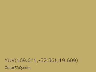 YUV 169.641,-32.361,19.609 Color is a normal yellow color and the nearest color is Dark Khaki #bdb76b. Hex code #c0ab68 and RGB value is rgb(192,171,104). In RGB color space, this color is composed of 75% red, 67% green, 41% blue, In CMYK color space, this color is composed of 0% cyan, 11% magenta, 46% yellow , 25% black , In HSL color space, this color has a hue angle of 46° , 41% saturation and 58% lightness.