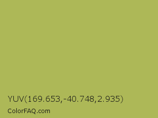 YUV 169.653,-40.748,2.935 Color is a normal yellow color and the nearest color is Olive Green #b5b35c. Hex code #adb857 and RGB value is rgb(173,184,87). In RGB color space, this color is composed of 68% red, 72% green, 34% blue, In CMYK color space, this color is composed of 6% cyan, 0% magenta, 53% yellow , 28% black , In HSL color space, this color has a hue angle of 67° , 41% saturation and 53% lightness.
