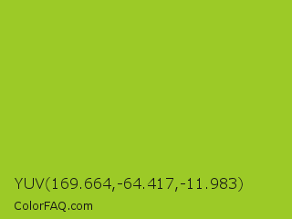 YUV 169.664,-64.417,-11.983 Color is a normal lime color and the nearest color is Atlantis #97cd2d. Hex code #9cca27 and RGB value is rgb(156,202,39). In RGB color space, this color is composed of 61% red, 79% green, 15% blue, In CMYK color space, this color is composed of 23% cyan, 0% magenta, 81% yellow , 21% black , In HSL color space, this color has a hue angle of 77° , 68% saturation and 47% lightness.