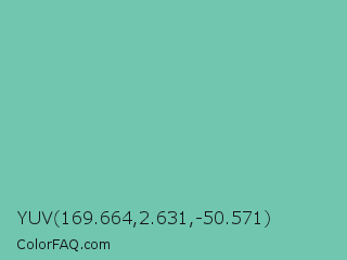 YUV 169.664,2.631,-50.571 Color is a light cyan color and the nearest color is Neptune #7cb7bb. Hex code #70c6af and RGB value is rgb(112,198,175). In RGB color space, this color is composed of 44% red, 78% green, 69% blue, In CMYK color space, this color is composed of 43% cyan, 0% magenta, 12% yellow , 22% black , In HSL color space, this color has a hue angle of 164° , 43% saturation and 61% lightness.