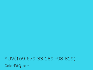 YUV 169.679,33.189,-98.819 Color is a normal cyan color and the nearest color is Turquoise #40e0d0. Hex code #39d6ed and RGB value is rgb(57,214,237). In RGB color space, this color is composed of 22% red, 84% green, 93% blue, In CMYK color space, this color is composed of 76% cyan, 10% magenta, 0% yellow , 7% black , In HSL color space, this color has a hue angle of 188° , 83% saturation and 58% lightness.