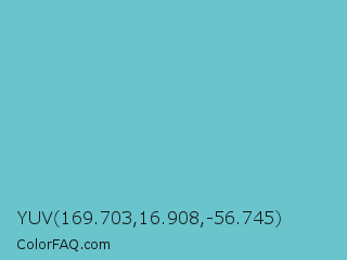 YUV 169.703,16.908,-56.745 Color is a light cyan color and the nearest color is Downy #6fd0c5. Hex code #69c4cc and RGB value is rgb(105,196,204). In RGB color space, this color is composed of 41% red, 77% green, 80% blue, In CMYK color space, this color is composed of 49% cyan, 4% magenta, 0% yellow , 20% black , In HSL color space, this color has a hue angle of 185° , 49% saturation and 61% lightness.