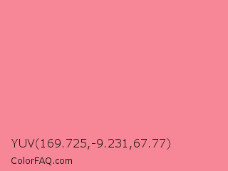YUV 169.725,-9.231,67.77 Color is a light red color and the nearest color is Tulip #ff878d. Hex code #f78697 and RGB value is rgb(247,134,151). In RGB color space, this color is composed of 97% red, 53% green, 59% blue, In CMYK color space, this color is composed of 0% cyan, 46% magenta, 39% yellow , 3% black , In HSL color space, this color has a hue angle of 351° , 88% saturation and 75% lightness.