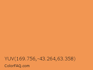 YUV 169.756,-43.264,63.358 Color is a light orange color and the nearest color is Tan Hide #fa9d5a. Hex code #f29652 and RGB value is rgb(242,150,82). In RGB color space, this color is composed of 95% red, 59% green, 32% blue, In CMYK color space, this color is composed of 0% cyan, 38% magenta, 66% yellow , 5% black , In HSL color space, this color has a hue angle of 26° , 86% saturation and 64% lightness.