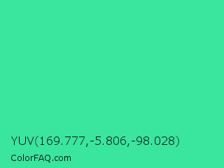 YUV 169.777,-5.806,-98.028 Color is a normal green color and the nearest color is Eucalyptus #44d7a8. Hex code #3ae59e and RGB value is rgb(58,229,158). In RGB color space, this color is composed of 23% red, 90% green, 62% blue, In CMYK color space, this color is composed of 75% cyan, 0% magenta, 31% yellow , 10% black , In HSL color space, this color has a hue angle of 155° , 77% saturation and 56% lightness.