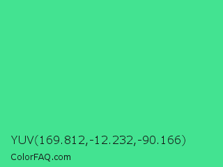 YUV 169.812,-12.232,-90.166 Color is a normal green color and the nearest color is Eucalyptus #44d7a8. Hex code #43e391 and RGB value is rgb(67,227,145). In RGB color space, this color is composed of 26% red, 89% green, 57% blue, In CMYK color space, this color is composed of 70% cyan, 0% magenta, 36% yellow , 11% black , In HSL color space, this color has a hue angle of 149° , 74% saturation and 58% lightness.