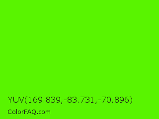 YUV 169.839,-83.731,-70.896 Color is a normal green color and the nearest color is Bright Green #66ff00. Hex code #59f400 and RGB value is rgb(89,244,-0). In RGB color space, this color is composed of 35% red, 96% green, 0% blue, In CMYK color space, this color is composed of 64% cyan, 0% magenta, 100% yellow , 4% black , In HSL color space, this color has a hue angle of 98° , 100% saturation and 48% lightness.