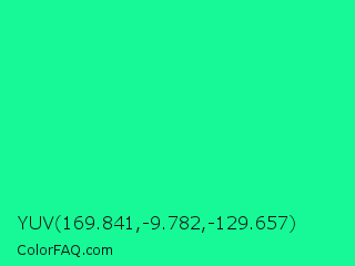 YUV 169.841,-9.782,-129.657 Color is a normal green color and the nearest color is Medium Spring Green #00fa9a. Hex code #16f996 and RGB value is rgb(22,249,150). In RGB color space, this color is composed of 9% red, 98% green, 59% blue, In CMYK color space, this color is composed of 91% cyan, 0% magenta, 40% yellow , 2% black , In HSL color space, this color has a hue angle of 154° , 95% saturation and 53% lightness.
