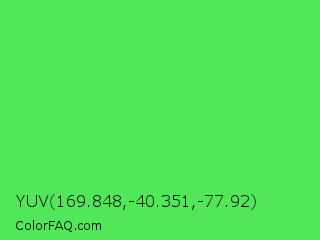 YUV 169.848,-40.351,-77.92 Color is a light green color and the nearest color is Screamin Green #66ff66. Hex code #51e758 and RGB value is rgb(81,231,88). In RGB color space, this color is composed of 32% red, 91% green, 35% blue, In CMYK color space, this color is composed of 65% cyan, 0% magenta, 62% yellow , 9% black , In HSL color space, this color has a hue angle of 123° , 76% saturation and 61% lightness.
