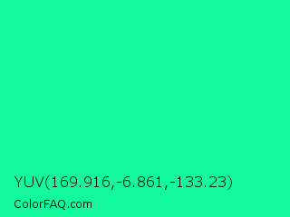 YUV 169.916,-6.861,-133.23 Color is a normal green color and the nearest color is Medium Spring Green #00fa9a. Hex code #12fa9c and RGB value is rgb(18,250,156). In RGB color space, this color is composed of 7% red, 98% green, 61% blue, In CMYK color space, this color is composed of 93% cyan, 0% magenta, 38% yellow , 2% black , In HSL color space, this color has a hue angle of 156° , 96% saturation and 53% lightness.