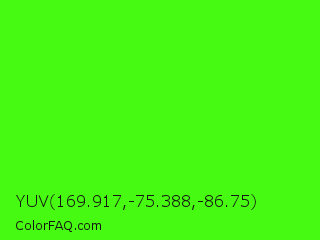 YUV 169.917,-75.388,-86.75 Color is a normal green color and the nearest color is Neon Green #39ff14. Hex code #47fa11 and RGB value is rgb(71,250,17). In RGB color space, this color is composed of 28% red, 98% green, 7% blue, In CMYK color space, this color is composed of 72% cyan, 0% magenta, 93% yellow , 2% black , In HSL color space, this color has a hue angle of 106° , 96% saturation and 52% lightness.
