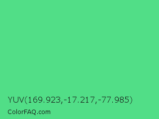 YUV 169.923,-17.217,-77.985 Color is a normal green color and the nearest color is Very Light Malachite Green #64e986. Hex code #51de87 and RGB value is rgb(81,222,135). In RGB color space, this color is composed of 32% red, 87% green, 53% blue, In CMYK color space, this color is composed of 64% cyan, 0% magenta, 39% yellow , 13% black , In HSL color space, this color has a hue angle of 143° , 68% saturation and 59% lightness.